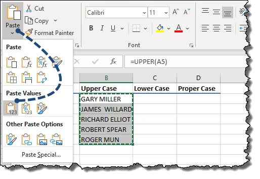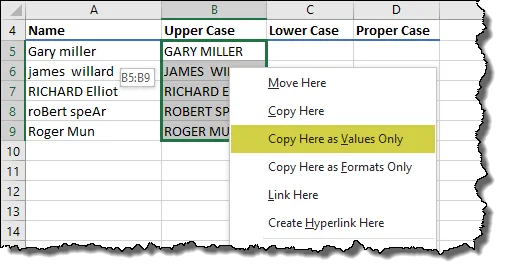 But let’s say you don’t want the formulas in the results. You just want the new upper-cased versions of the names as if they had been hand-typed. There is an easy fix for that: