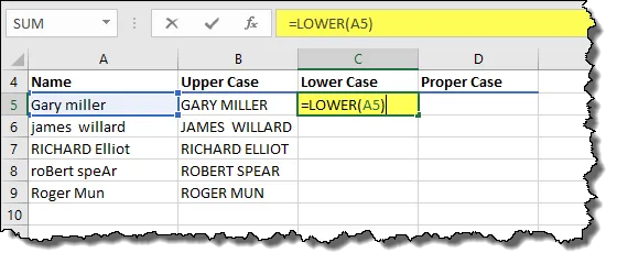 In our practice file, we will select cell C5 and enter the following formula to convert to lower case.