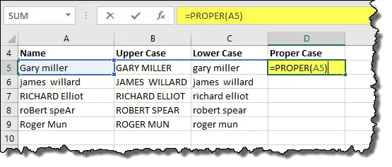 In our practice file, we will select cell D5 and enter the following formula to convert the text to proper case.