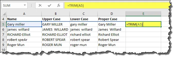= TRIM(“ This is a test of the TRIM function ”)In our sample file, we will select cell E5 and enter the following formula:
