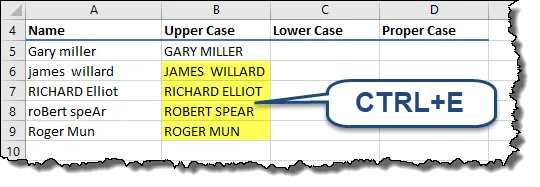 Flash Fill will fix the names in BOTH directions of the list. Not only will it create upper case versions of the names, but it is smart enough to detect that you only placed a single space between the names and that it should do the same thing. Also, because you didn’t add any additional leading or training spaces, Flash Fill doesn’t place any in the results list of names.