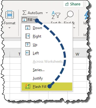 The Flash Fill tool can also be activated by selecting Home (tab) -> Editing (group) -> Fill (button) -> Flash Fill.