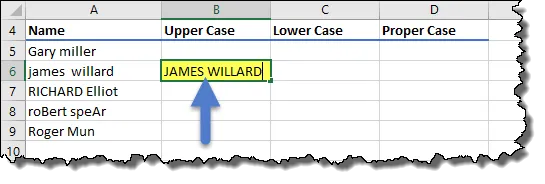 Flash Fill can fix that problem as well. Flash Fill can perform the TRIM and the UPPER functions simultaneously. The trick is to select a name that contains extra spaces before, after, or within itself. In this case, we will use “james willard”.