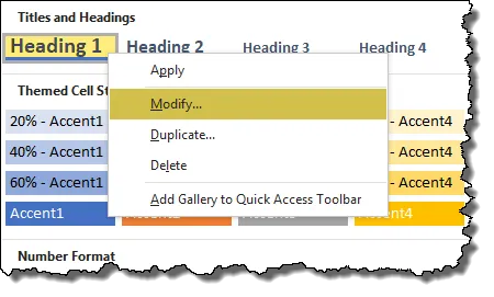 If we wish to use the Heading 1 style, but we wish it to be in all upper case letters, right-click on the Heading 1 style and select Modify.