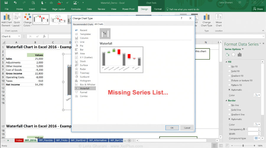 Go to Design > Change Chart Type and you will also notice that the new series is not there. Generally, in the Change Chart Type window, you should be able to see all the series listed below the Waterfall image and you should be able to change the chart series type of each of them individually. However, this setup doesn’t allow you to do that. The “Newseries” is basically invisible. This is the next disadvantage —that you cannot add additional series to the chart and get your customized version of the Waterfall Chart.