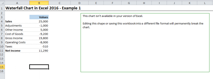 The last more obvious restriction is that the Waterfall chart can only be viewed by persons who have Excel 2016. If you are planning to send your files to others, you need to make sure this is the case, otherwise they cannot view the chart. This is what they see: