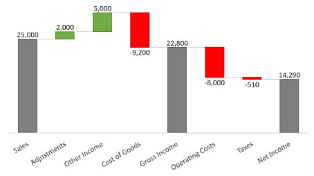 In the first example, we will be creating a Waterfall Chart that shows the variables which influenced the values from sales to net income. The example shows a subtotal in the middle which serves as the gross income. Other than that it shows the values of the change.