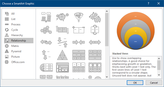 SmartArt was introduced to the world in Office 2007, and it provides an array of interesting shape combinations and artistic stylings.