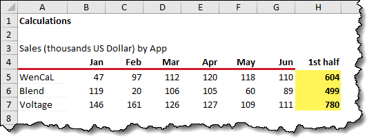 =Dashboard!B3Next, we create a lookup to find the selected App in the data and return the related monthly sales. This can be performed with any lookup function you prefer (Lookup, VLookup, HLookup, Index/Match, XLookup). We will use HLookup.