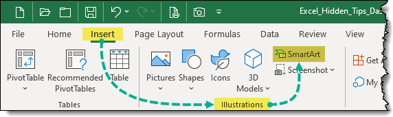 We access SmartArt by selecting Insert (tab) -> Illustrations (group) -> SmartArt.