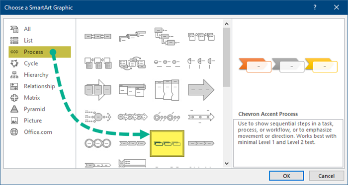 We can select any SmartArt shape we wish. In this example, we’ll use the Chevron Accent Process shapes.