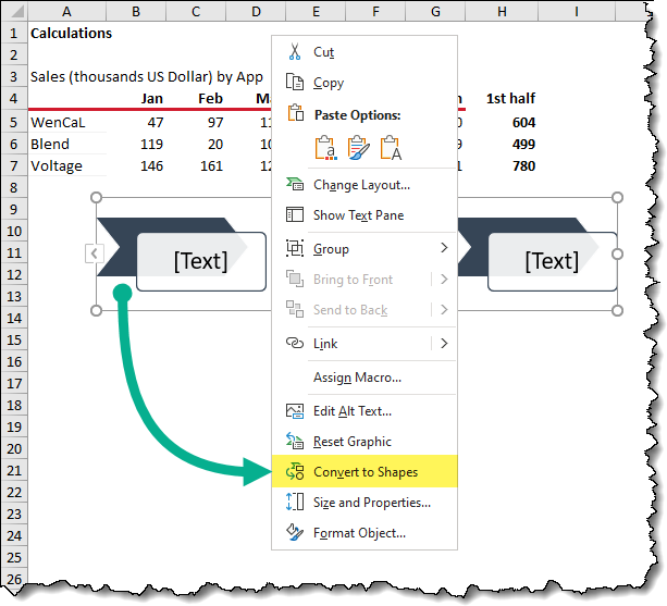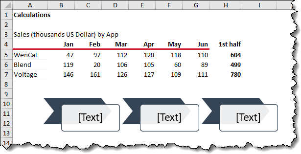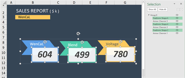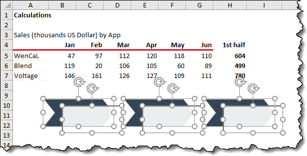 This makes for a much more visually interesting report while retaining the dynamic nature of standard cells. If our data is updated and the totals change, the once-SmartArt shape will reflect the change in data.