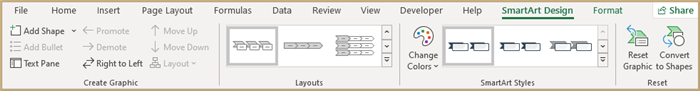 Once we have our SmartArt shape inserted, we are presented with new ribbons that allow us to customize the look, and in some cases behavior, of the SmartArt shape.