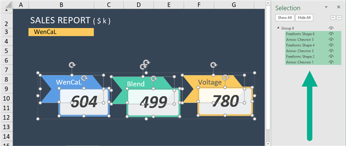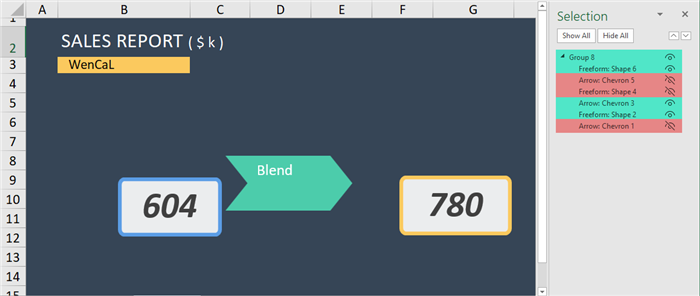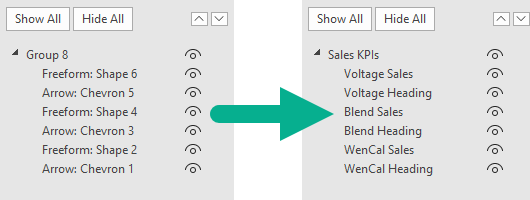 By clicking the small “eye” icon to the right of each listed shape, you can selectively hide or display any shape on the worksheet.