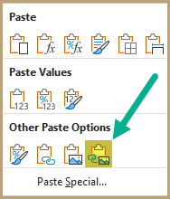 Next, select the dashboard sheet and click the lower part of the Paste button and select Linked Picture.