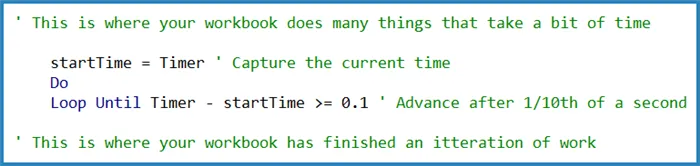 Loop Until Timer - startTime >= 0.1 ' Advance after 1/10th of a second
