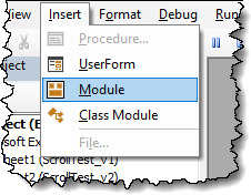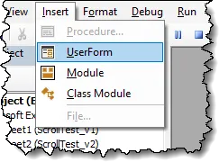 To display the UserForm when the user clicks the macro launch button, we create a traditional Module sheet (Insert -> Module) and load the UserForm into memory.