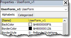 - Rename the UserForm by selecting (Name) in the Properties We will name our UserForm “UserForm_v1”.