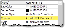 - Set the UserForm Caption (what is displayed in the Title Bar area) to read “Create PDF Documentation”. This, of course, can be anything you wish it to display.