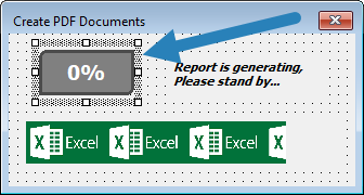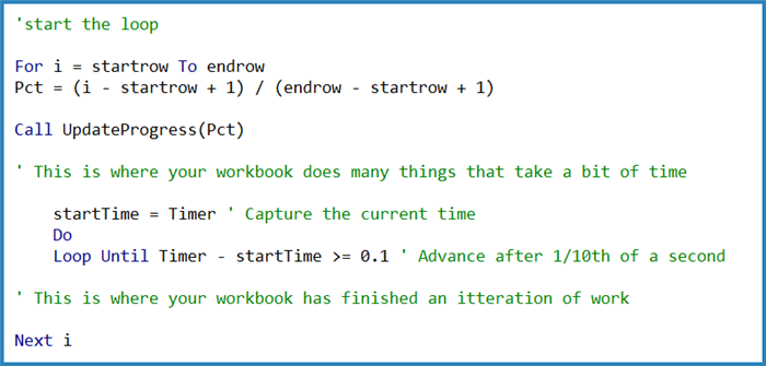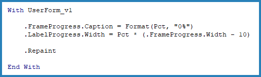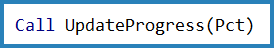 - The Call UpdateProgress(Pct) line passes the calculated percentage (Pct) to the UpdateProgress This percentage will be displayed in the Caption of the Frame object.