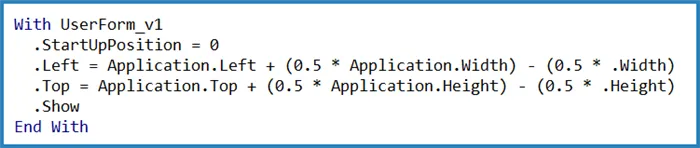 To ensure the UserForm for the progress bar appears in the center of the screen, we calculate the center position with some crafty math. After the calculations are complete, we Show the memory-loaded UserForm.