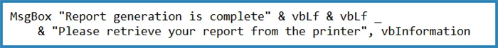 MsgBox "Report generation is complete" & vbLf & vbLf & "Please retrieve your report from the printer", vbInformation