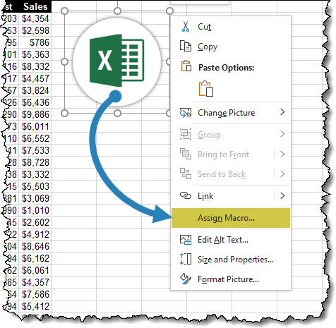 We will add an Excel icon image and assign the macro to the image. This is done by right-clicking on the image and selecting “Assign Macro”.