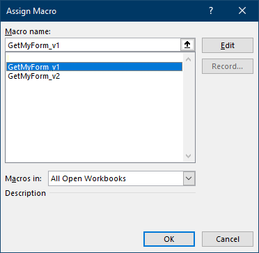 Next, in the Assign Macro dialog box, select the macro located on the traditional module sheet that loads and shows the UserForm. In our case, it was named “GetMyForm_v1”.
