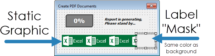 - Within the boundary of the Frame, insert another Label This label will not contain text, rather it will act as the scroll bar. This is performed by coloring the interior of the label and resizing it incrementally, making it larger and larger as the macro progresses. Label Properties you may wish to experiment with are: