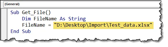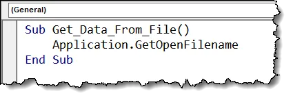 To use the GetOpenFilename method in a macro, start a new procedure and enter the following code.