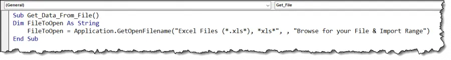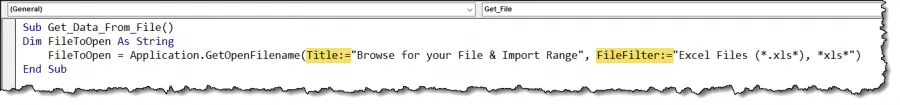 FileToOpen = Application.GetOpenFilename(Title:=“Browse for your File & Import Range”, FileFilter:= “Excel Files (*.xls*), *xls*”)