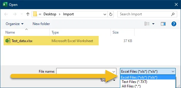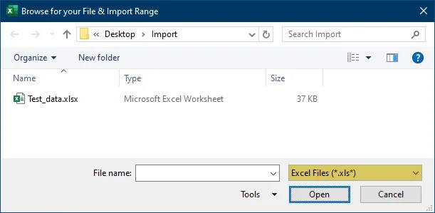 - Finally, we will only display Excel files in the dialog box; i.e. files ending in .XLS, .XLSX, .XLSM, or .XLSB.