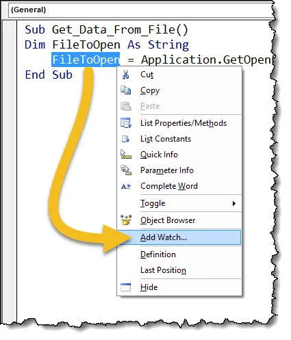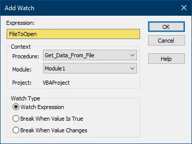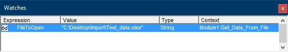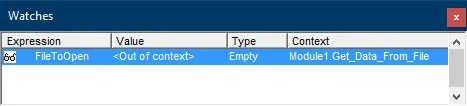 Examining the Watch window, we can see the selected file name has been captured and stored in the “FileToOpen” variable. (NOTE: You can also hover your mouse pointer over any reference to “FileToOpen” and observe a pop-up that displays the variable’s contents.)