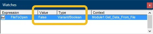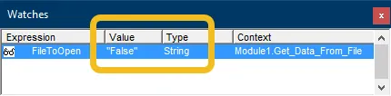 If we execute the code with this modification, we can see when we pause on the last line that the “FileToOpen” variable is holding a Boolean FALSE response, not a text response.