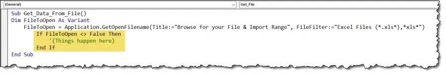 If we launch the code and press the Cancel button without selecting a file, the GetOpenFilename method returns a “False” response and stores it in our “FileToOpen” variable.