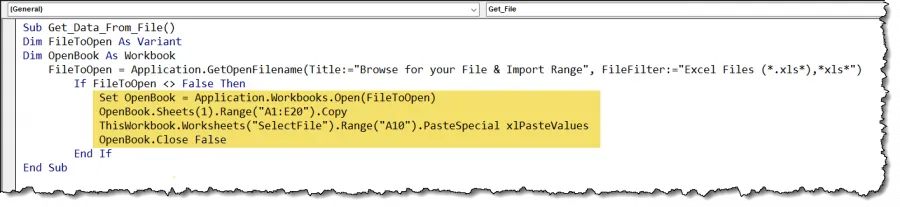 Our objective is to write a simple macro that prompts the user for a file using a traditional “file open” dialog box. With this information, we will open the file in the background, copy a range of data, paste it into our active worksheet, then close the user-selected file.