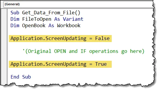 To reduce screen flicker when opening background files, we will add the “Application.ScreenUpdating” toggle to our code.