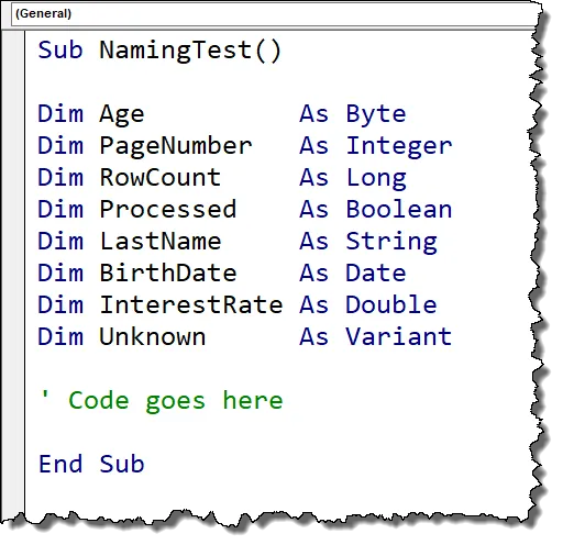 Below are examples of variable being declared at the beginning of a VBA procedure.