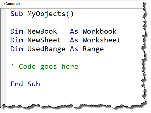 Set UsedRange = SelectionIt’s easy to forget to use the SET statement when assigning values to object variables. Always remember: if the variable being populated looks like an object in Excel, use the SET statement.