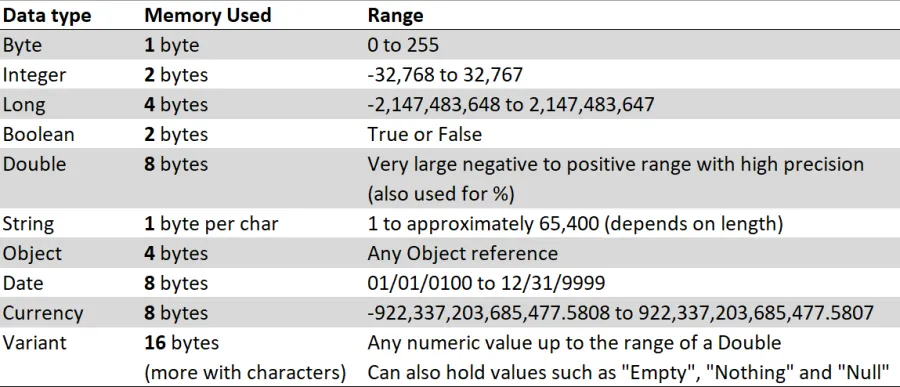 You can see from the table above, the smaller the memory used, the smaller the available range. Since a Byte only consumes 1 byte of memory, it can only hold 256 different things (but not all at the same time.) Where as a Currency type consumes 8 bytes and has a range of over 1.8 quintillion different things (again, not at the same time.)
