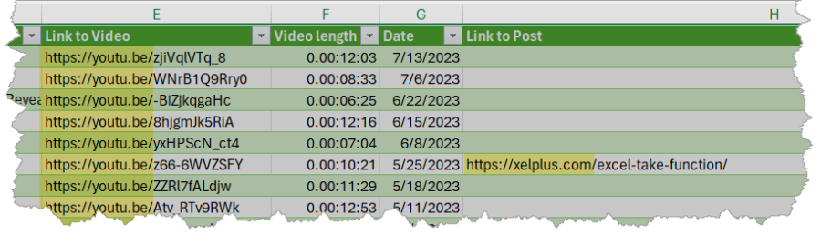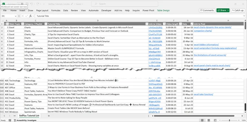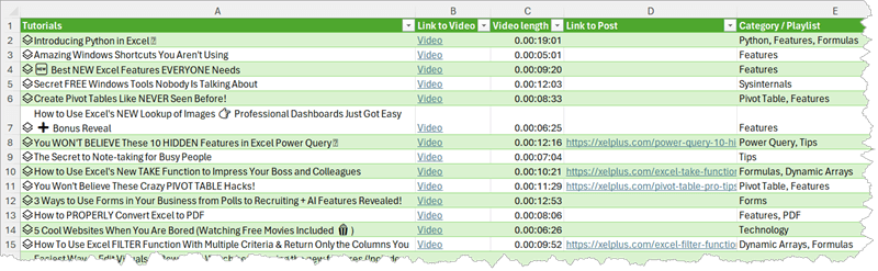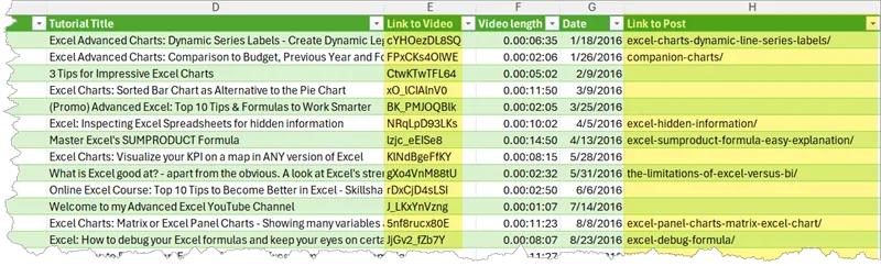 In the file, you will find the tutorials categorized into Main Topic and Category / Playlist. The Excel table includes Link to Video, as well its Length and Date when it was first published. Whenever the video is accompanied by a blog post, you’ll also find a Link to Post. This will take you to the relevant article on this website, where you can read more in-depth about the subject, download the Excel workbook with examples and follow along with me.