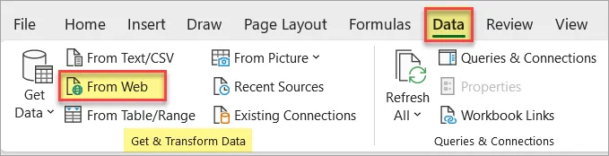 Open a blank workbook, go to Data (tab) > Get & Transform Data (group) > From Web.