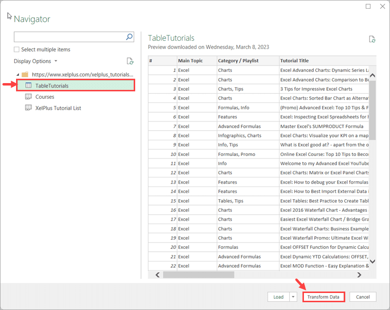 You will see a preview of the tables and sheets available in the online workbook. There are two sheets, but we are interested in the table. Select TableTutorials and click on Transform Data.