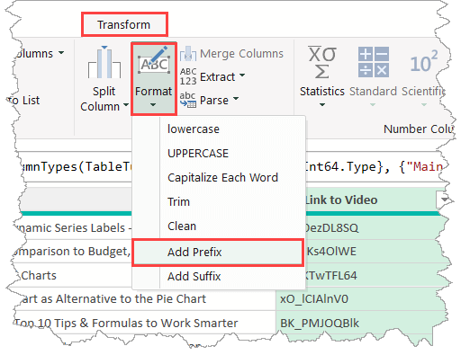 Select the Link to Video column, go to Transform (tab) > Text Column (group) > Format > Add Prefix