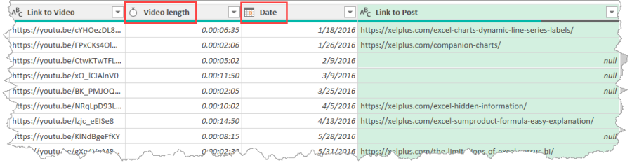 Before we load it to Excel, though, let’s ensure all the data types are correct. You should see Integer for #, Duration for Video Length, Date for Date, and Text for the other columns.