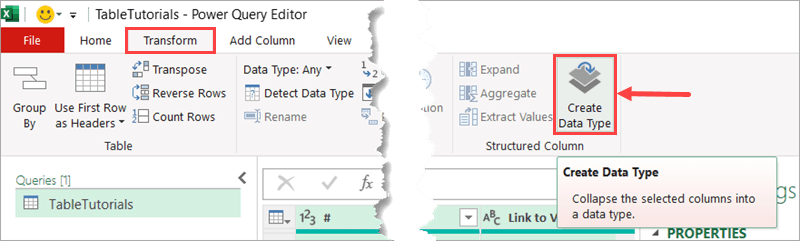 Select everything using the shortcut Ctrl + A. Go to Transform (tab) > Structured Column (group) > Create Data Type.