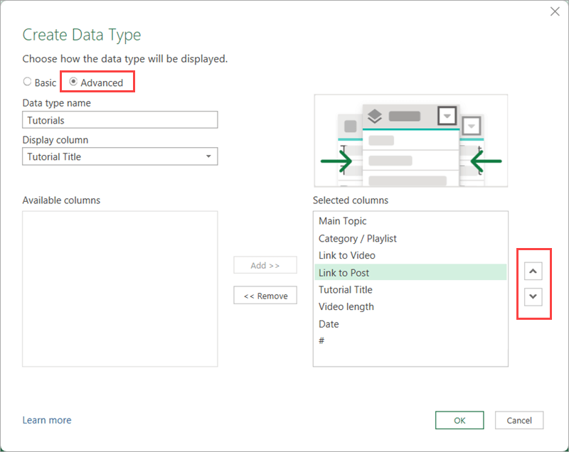 Under Advanced Options, you can add or remove columns. Since we started with all columns selected, there’s nothing for us to add, but in case you didn’t – you have an opportunity to add relevant columns here. You can also rearrange the order, for example bring the # down and both Link columns up.