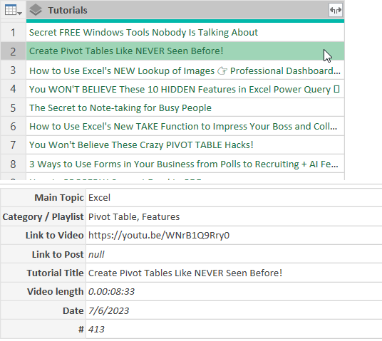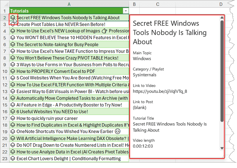 The loaded table updates and now you only see the single column called Tutorials with Tutorial Titles. But notice the symbol to the left of each Title – Show Card. When you click on the symbol (or use the shortcut Ctrl + Shift + F5), a card will pop up with all the data we have on that specific tutorial.