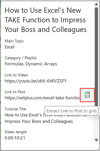 If you hover over each item on the card, you’ll notice another icon – Extract to grid. When you click on it, a new column will be added to the table, with the requested values, e.g. “Link to Post”.