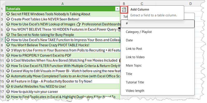 So, if we go ahead and extract Link to Video and Link to Post, will we have our clickable links? Not just yet. But notice something about the extracted columns. If you look in the formula bar, you’ll see there is now a formula behind the extracted value. It references the [Tutorials] column in combination with .[Link to Video] – the extracted column (@ indicates <this row> in a multi-row table).